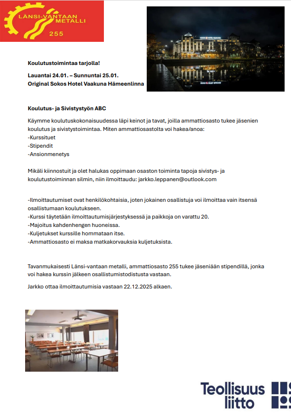 Teollisuusliitto hakee aluetoimitsijaa Sisä-Suomen alueelle (19.12.2025) Etsimme Sisä-Suomen toiminta-alueelle positiivista, motivoitunutta, rohkeaa ja ennakkoluulotonta aluetoimitsijaa – sinua, joka olet valmis jakamaan osaamistasi ja oppimaan uutta. Sinut tunnetaan ratkaisukeskeisyydestäsi ja sujuvista vuorovaikutus-...