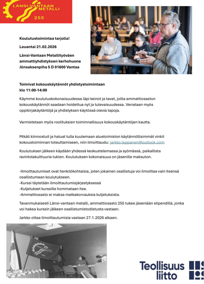 Ammattiosastojen kevätkokoukset on pidettävä maalis–huhtikuun aikana (2.2.2026) Sääntöjen mukaan kevätkokous täytyy pitää maalis–huhtikuussa ja se on kutsuttava koolle viimeistään kaksi viikkoa ennen kokousta. Ammattiosaston kokoukset kutsutaan koolle joko työpaikkojen ilmoitustauluilla, liiton tai...