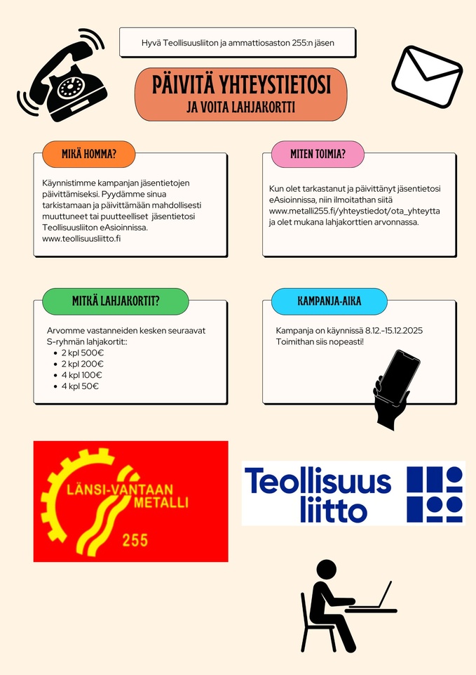 Kun olet tarkastanut ja päivittänyt jäsentietosi e-Asioinnissa, niin ilmoitathan siitä https://www.metalli255.fi/yhteystiedot/ota_yhteytta ja olet mukana lahjakorttien arvonnassa.